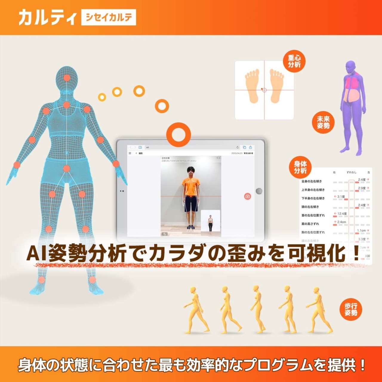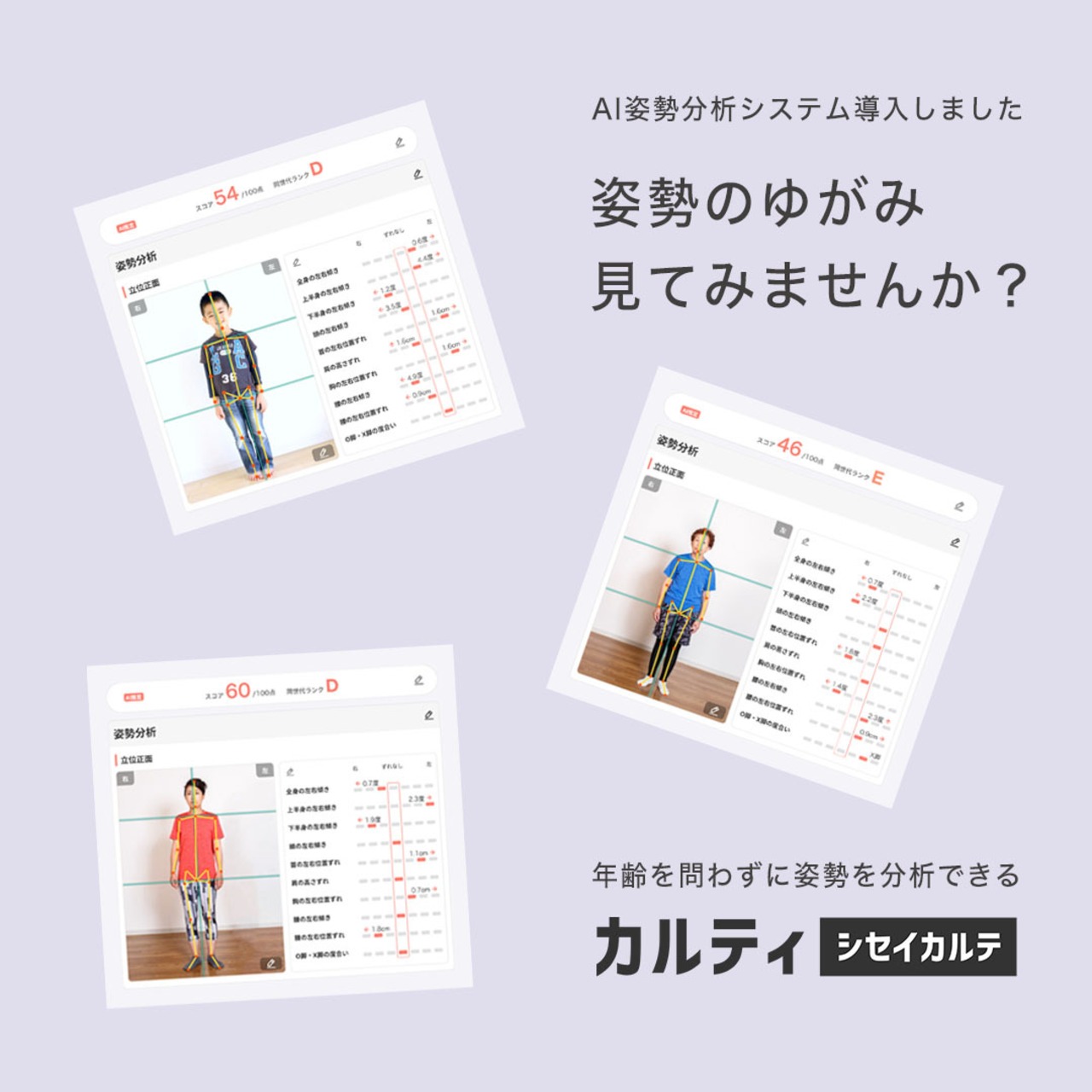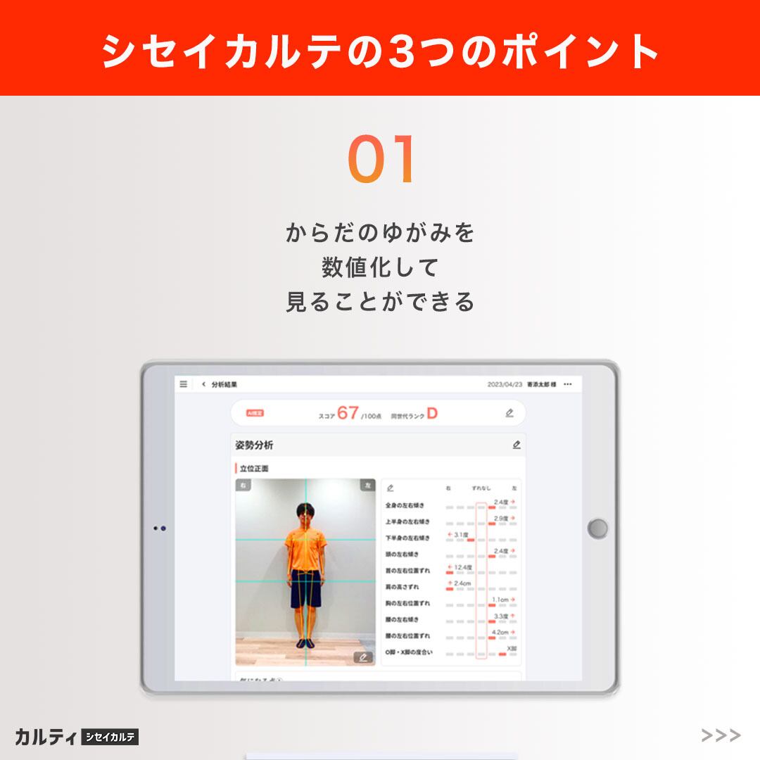 ・精密な歪みスコア: 体の各部位が何センチ、何度歪んでいるかを数値化