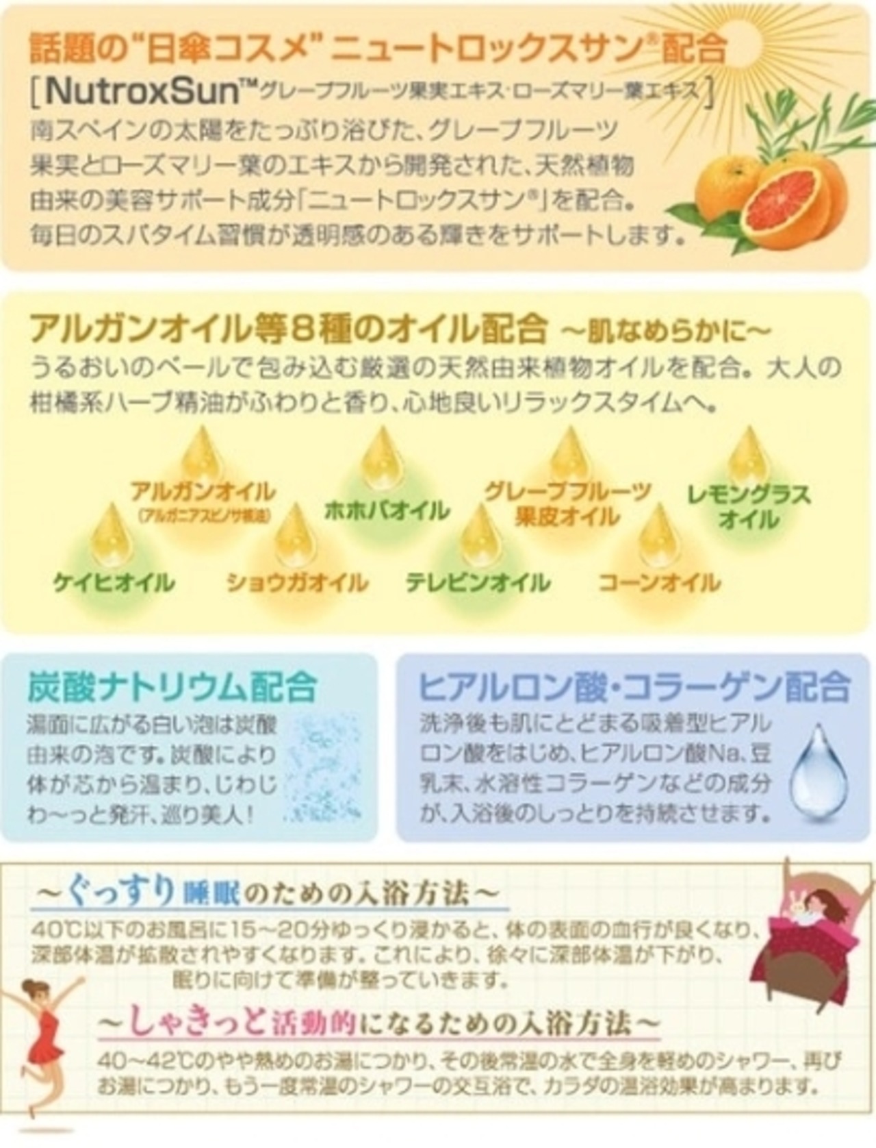 温度と時間: 38~40℃のぬるめのお湯に、15~20分間ゆったりと浸かってください。